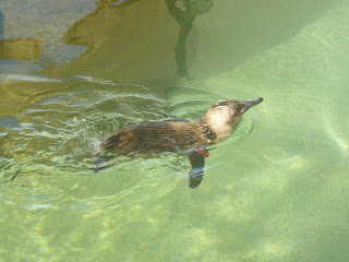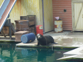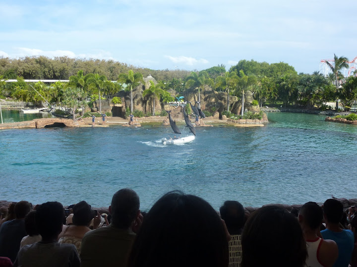 After the sea lion show we went to the dolphin area and sat down for 'Imagine', a presentation featuring about 8 different dolphins in their HUGE man-made lagoon. Looking at them swimming around and playing in the gigantic pools made me feel sorry for the dolphins locked up at West Edmonton Mall because their home is about 1/20th of the size. The show itself was quite interesting, as it told a history of the dolphins in and around Australia all while they were performing tricks with their trainers. I couldn't believe how high they were able to jump, but my favorite part was when the trainers were able to ride on their backs. It reminded me of the movie 'Free Willy', which I loved as a kid. It was beautiful to see how they interacted with humans and how free and happy they seemed in their environment.
