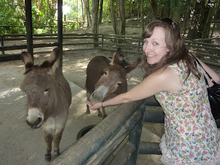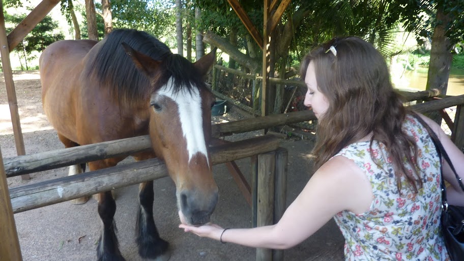 Our tour with the tractor stopped at a beautiful little pond area where ducks and fish were swimming around and enjoying the weather. We fed some of the ducks pieces of bread and then walked towards the plantation's stables, which is home to some of the regular farm animals you'd find anywhere. Cameron and I bought a satchel of pet food and we fed the miniature donkeys, chickens, emus, kangaroos, and the horse. One very exciting discovery is that I'm no longer allergic to horses! I stuck my hand out flat and this big old horse ate the food off it in about half of a second. I took my chances feeding him, but I didn't react in any way so I'm happy to know I've outgrown that allergy since I've always loved horses. I also enjoyed feeding the donkeys because they were just so sweet and seemed happy to see me.