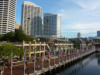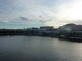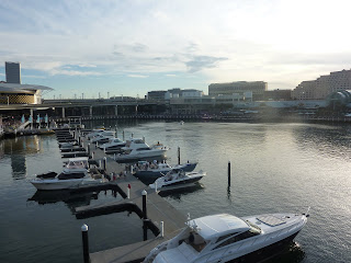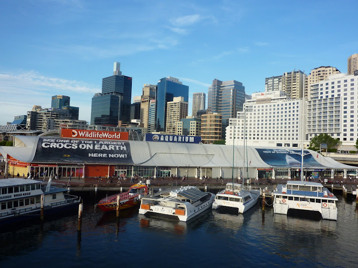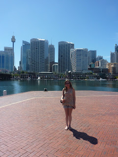 On Sunday the 7th of November Cameron, Mr. Styles and myself got up at around 6:00AM to prepare for the drive to the airport. I double and triple checked my bags and then we were off. The Gold Coast airport is much closer than the one in Brisbane which is where I first arrived. It only takes about half an hour to get to the one on the Gold Coast whereas it takes over an hour just to get to the city of Brisbane, let alone the airport. Cameron and I quickly found the area for our plane and only had to wait about half an hour before boarding. The plane ride was smooth and quick and it felt like no time at all before we had landed in Sydney. We headed down to the airport doors where all of the cabs were waiting and hopped into one of the available ones and we were on our way to the hotel. At about 12:30PM we arrived at the hotel and dropped off our bags to be looked after in their storage room. The hotel was so much different than I had imagined it to be. One of the words I'd use to describe it is 'grand' because it towered above me when I looked up and the building itself is quite sophisticated and classy. It used to be a wool factory in the 1800's before it was restored and converted into a hotel so the inside still retains many of the details of the factory, such as the large columns and wood-paneled floors. We were too early to check in and weren't able to visit our room at this time so after we dropped off our bags we decided to explore a bit of Sydney and go for a walk. On the second floor of the hotel there is a walkway that leads almost directly to Darling Harbour, so after about 5 minutes we arrived at one of the most beautiful areas of Sydney and one of the prettiest places I've ever seen.