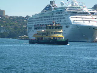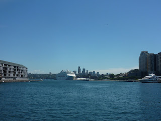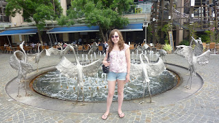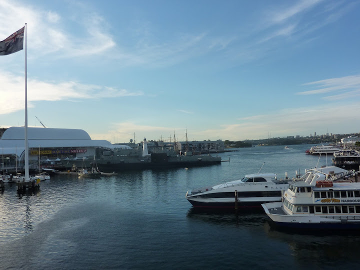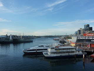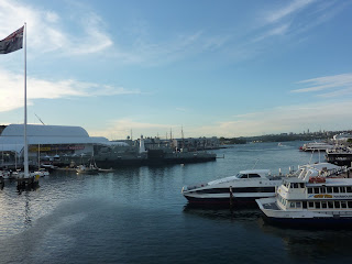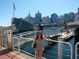 Darling Harbour is a large U-shaped area of water where boats are able to drive into and be stored. It is surrounded by many different restaurants, shops, and the Harbourside mall. Just nearby is the Sydney Imax Theatre, which is home to the world's biggest screen. Street performers are constantly doing tricks and shows for passerbys and on either side of the harbour is the National Maritime Museum as well as the Sydney Aquarium and Sydney Wildlife World. Darling Harbour is just near the heart of Sydney and besides being one of the prettiest areas it also is within walking distance of the majority of the cities major attractions. I felt so lucky that our hotel was only a few minutes away from this incredible area, and I can't imagine staying anywhere else. After walking the loop of the Harbour, which takes about 10 minutes, we walked inside of the Harbourside mall and explored the shops. We picked up lunch while we were there and then got an ice cream each to eat by the water. The view is just unbelievable. You are able to see several skyscrapers (there are hundreds in Sydney) as well as many of the expensive boats and there was even a cruise ship in the distance! Since the aquarium and the Wildlife World are just nearby there is actually a mini-train that goes all around the harbour from the Harbourside mall on the one end to the Aquarium and Wildlife World on the other. It's only about a 10 minute walk, but it is a cute way to get from place to place especially for families. There is also an area to catch a ferry on either side of the Harbour, one is beside the National Maritime Museum and the other is just past the aquarium. The National Maritime Museum was quite interesting to see even from afar as it had a big navy boat out front as well as a real submarine. Once we finished our ice cream we headed back towards our hotel to check in.