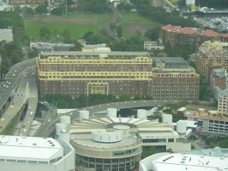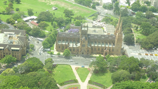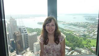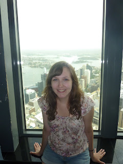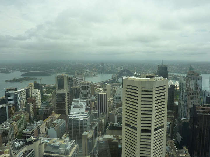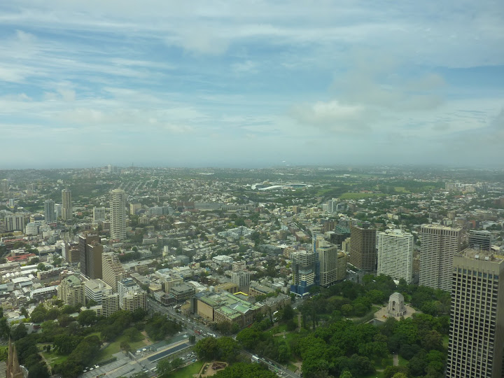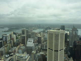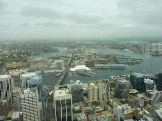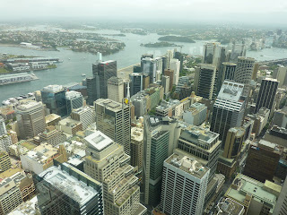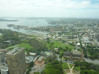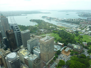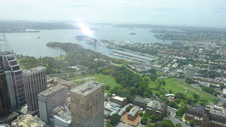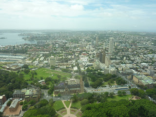 The 9th of November, a Tuesday, was a great last day to spend in Sydney. The weather stayed nice and sunny the whole day but not to the point it would burn you, and the breeze was just perfect. To start the morning off we caught a cab to a place I'd read about online called the Bourke Street Bakery. It was only a few blocks away, but the traffic in Sydney is so hectic that it took about as long to cab there as it would have to walk. The streets are absolutely covered in people and there are about 40 waiting at each and every crosswalk walking in packs to and from their destinations. It is what I imagine New York City looks like as well, with all of the huge buildings, bustling streets and barely-moving traffic. When we got there we noticed it was an extremely small bakery, with the area the customers stand in to order being slightly smaller than a regular-sized bathroom. Everything was quite cramped but there was a lot of items on display to order than somehow fit into the show window. Everything looked amazing; there were meat pies and sausage rolls, fruit tarts, lemon curd tarts, cinnamon rolls, danishes, chocolate tarts, french pastries, croissants, breads, rolls, and so many more items that were tailored just for breakfast and lunch. Cameron got a meat pie and a sausage roll while I ordered the carrot cake, which seemed to be the most popular item the online reviewers recommended. They were completely right since it turned out to be the best carrot cake I've ever had, and I'm not even that big of a fan. Cameron loved his meat pie and sausage roll, and from what I've tried of them they were incredible. I got a chocolate tart to take with me after we finished and then we caught another cab to the Sydney Tower, our next destination. We were right near the middle of the city so it was easy to pick up a cab to get to where we needed to go, although the time we spent waiting at the lights inside of the cab was pretty depressing.