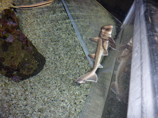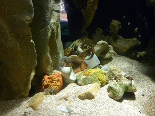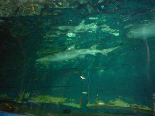 When we got our room keys we discovered we were staying on the 8th floor, which is the highest I've ever been in a hotel (I think I've only ever been in 3 hotels altogether anyways). Once we got off the elevator on level 8 it was a very unique setup for the rooms. Instead of a flat, square floor to walk on there were walkways that went all the way across the 8th floor, but you could see over the sides below and above you! Since the building used to be used as a wool factory the architecture has stayed the same. From just outside of our room in the hall we would be able to lean over the railing and see all the way up to the penthouse or down to the main floor. It was quite different for a hotel but sort of neat to know that the building is somewhat historic in a sense. Our room itself was quite large with a very high ceiling, a full kitchen, and a balcony. Unfortunately our balcony only gave us a view of the building beside us, but it was cool to be staying in a room with a working stove, a washer, and a dryer. We didn't end up using those appliances but it kind of felt like staying in an apartment for a few days. Cameron and I unpacked to make ourselves at home then went back downstairs and across the walkway to head to the aquarium.