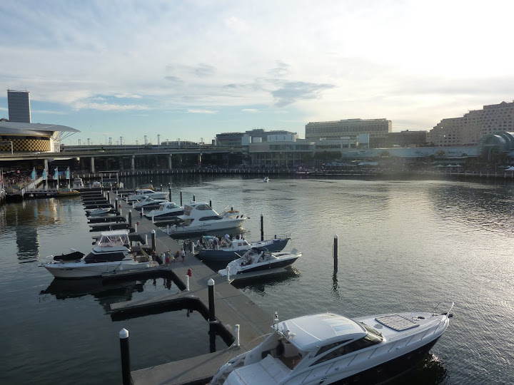 We got back to Circular Quay at about 6:30PM by which we were starting to get hungry. Once we hopped on the correct ferry at 5A it only took about 20 minutes to return to Darling Harbour, then another few minutes to find a nice restaurant to eat at. We picked another one with a beautiful view of the water and our food was excellent. After dinner we did another stroll around the water, looking up at the buildings and then down at the boats tied up for the night. We went back to the hotel afterwards to get ready for the next and final day in Sydney.