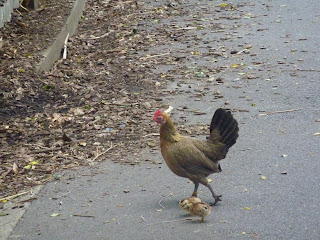 A Chicken and it's Chicks crossing a walkway (not part of the zoo!)